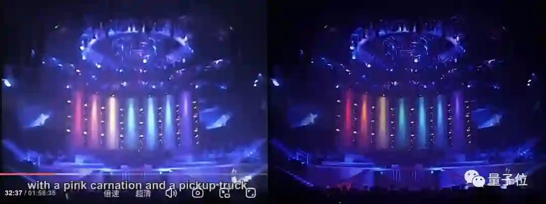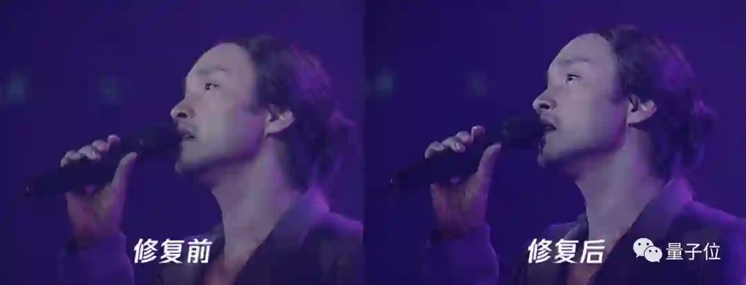 可以看到前后对比明显,修复后的张国荣脸部、舞台等细节清晰可见。