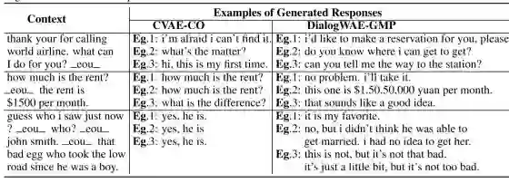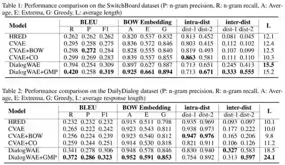 作者在两个开放域数据集Daliy Dialog(英语学习者使用的日常对话,13118组对话)和 Switchboard(2400组,70个话题,两人对话)上进行了实验,使用BLEU、BOW Embedding、intra-dist等作为衡量指标,结果表明在大多数情况下比现有的方法好的多。