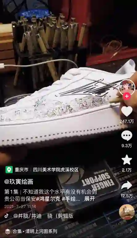 一个离我们更近的例子是,鸿星尔克通过抖音直播售卖一款小白鞋,用户“玖寅绘画”买到之后,出于自己的兴趣在鞋身上手绘“清明上河图”,并且把设计过程上传抖音。最终这支视频收获了将近250万个点赞,鸿星尔克立即联系创作者购买了版权并批量生产,上线后很快销售一空。整个过程不过一个月出头。