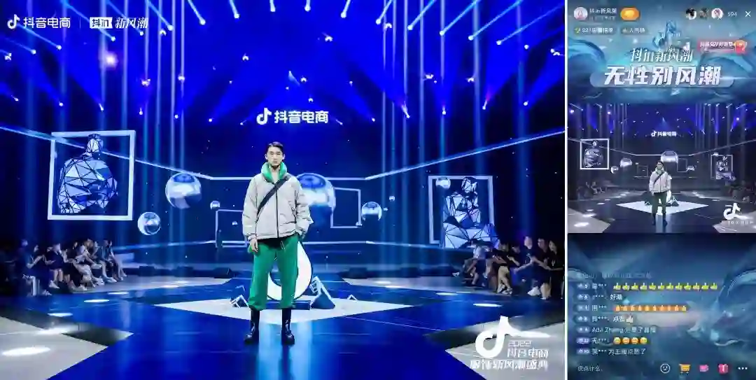2022年9月20日,抖音电商服饰新风潮盛典在杭州举行。和以往不同的是,抖音电商服饰行业的这次盛典,除了讨论重点议题的峰会,还举办了一场秋冬上新趋势大秀。“无性别风潮”、“运动闲适潮”、“优雅极简潮”、“顶流华风潮”、“复古未来潮”五大秋冬流行趋势,通过超30家知名品牌和新锐设计师品牌的近百套total look展现出来,呈现了一场与近期国内外时装大秀的同一水准的大秀。所有秀款都是秋冬上新趋势款,在现场直播中大部分都可即秀即买。