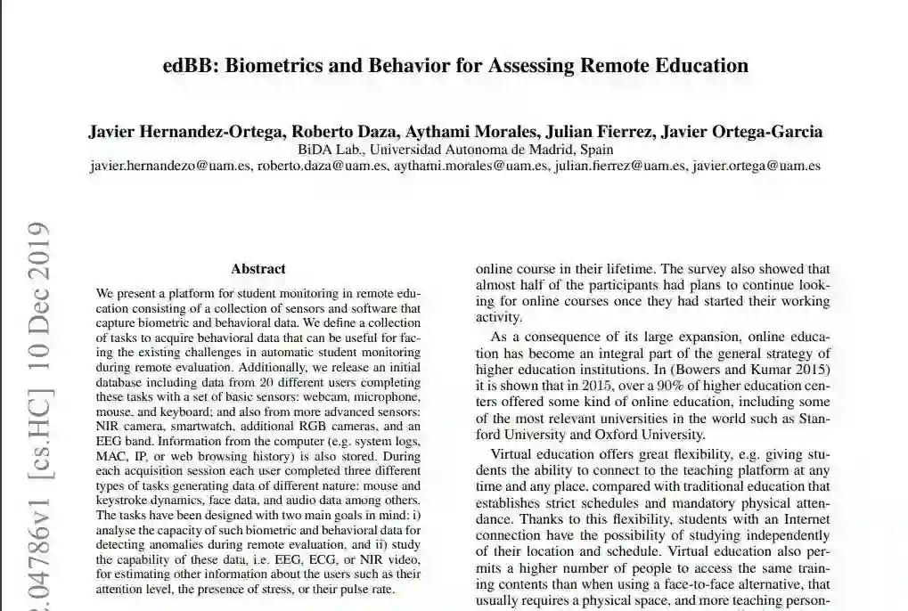 推荐理由:我们提供了一个用于远程教育中学生监控的平台,该平台由捕获生物特征和行为数据的传感器和软件组成。我们定义了一组任务来获取行为数据,这些数据对于应对远程评估过程中自动学生监控中的现有挑战很有用。此外,我们发布了一个初始数据库,其中包含来自20个不同用户的数据,这些用户使用一组基本传感器来完成这些任务:摄像头,麦克风,鼠标和键盘;以及更先进的传感器:NIR相机,智能手表,其他RGB相机和EEG频段。来自计算机的信息(例如系统日志,MAC,IP或Web浏览历史记录)也将被存储。在每个获取会话期间,每个用户完成三种不同类型的任务,生成不同性质的数据:鼠标和击键动态,面部数据和音频数据等。设计任务时要牢记两个主要目标:i)分析此类生物统计和行为数据的能力以在远程评估期间检测异常,并且ii)研究这些数据的能力,例如脑电图,心电图或近红外视频估计有关用户的其他信息,例如他们的注意力水平,压力的存在或他们的脉搏率。