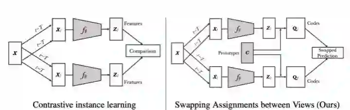 该方法与一般对比学习方法区别在于其对于负样本的处理方式:在SwAV中,作者采用了与SeLa方法相似的基于最优传输的聚类方法,对于同一个正样本在不同分支输入的扰动图片,SwAV希望一个分支得到的样本的特征表示与另一个分支中该样本所属的聚类中心尽量接近。即一般对比学习方法希望经过不同扰动的正样本之间相似度尽可能高,而在SwAV方法中希望经过一种扰动的正样本与经过另一种扰动的正样本所属的聚类中心之间的相似度尽可能高。正是因为用了聚类中心来代替直接使用负样本,SwAV方法对比学习计算中仅需对比固定个数的聚类中心,而与输入batch size大小无关,因而减少了对硬件显存大小的需求。