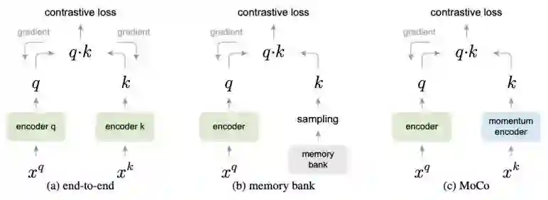 基于以上两点假设,作者分析了几种对比学习机制(如图 2 所示)。第一种是端到端训练,即对于所有的查询样本的编码结果(query)和字典键值(key)同时进行梯度传播,但这一方法中显存大小会极大地限制键值字典的大小,导致自监督任务难度降低,影响训练效果;第二种是基于memory bank的训练方法,迭代过程中将键值编码存储到一个memory bank中,每轮对比学习过程中所需要的字典键值直接从memory bank 里选取,而梯度计算只对查询样本的编码网络分支进行。因为MoCo不需要对键值字典的分支进行梯度计算,memory bank方法可以显著提升键值字典的容量,但是由于每个样本在memory bank中的键值在被模型重新编码时才会被更新,键值字典中键值间的一致性较差,从而降低了训练的稳定性。