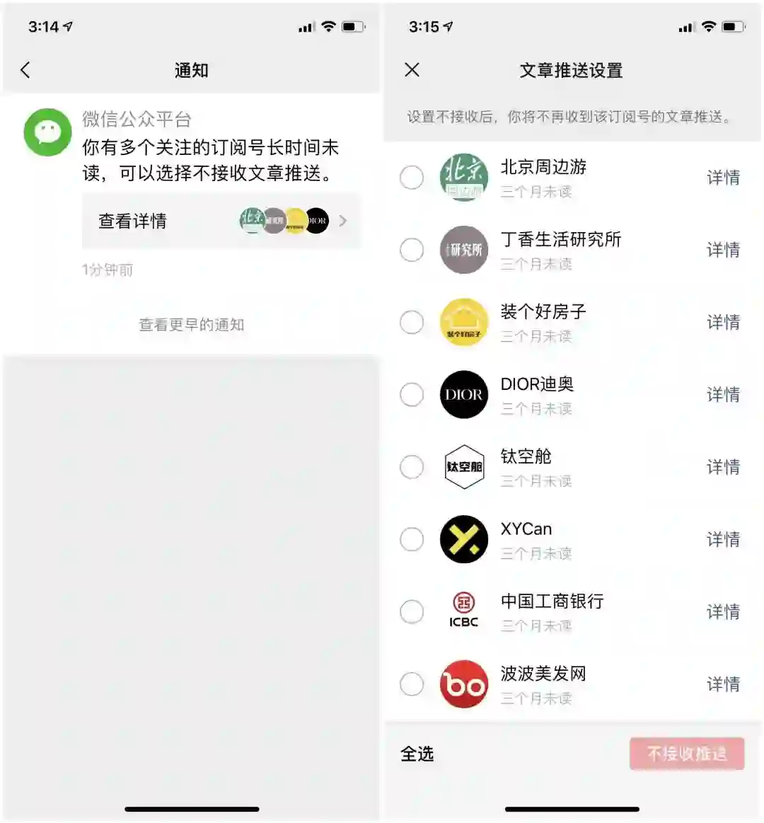 ——“你有多个关注的订阅号长时间未读,可以选择不接收文章推送”。