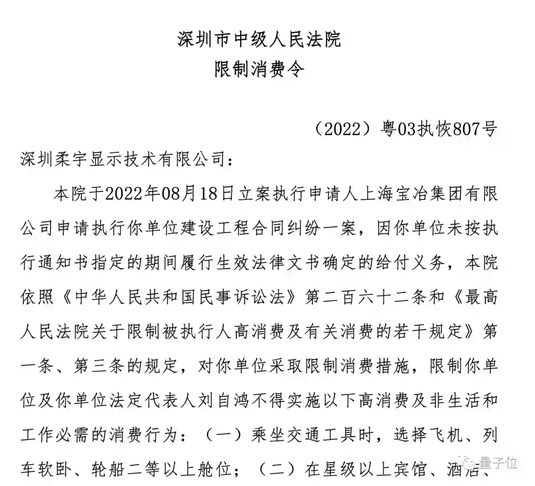 但柔宇科技并未在指定期间履行生效法律文书确定的给付义务,因此法院依法对其采取限制消费措施,限制该公司及公司法定代表人刘自鸿不得实施相应高消费及非生活和工作必需的消费行为。
