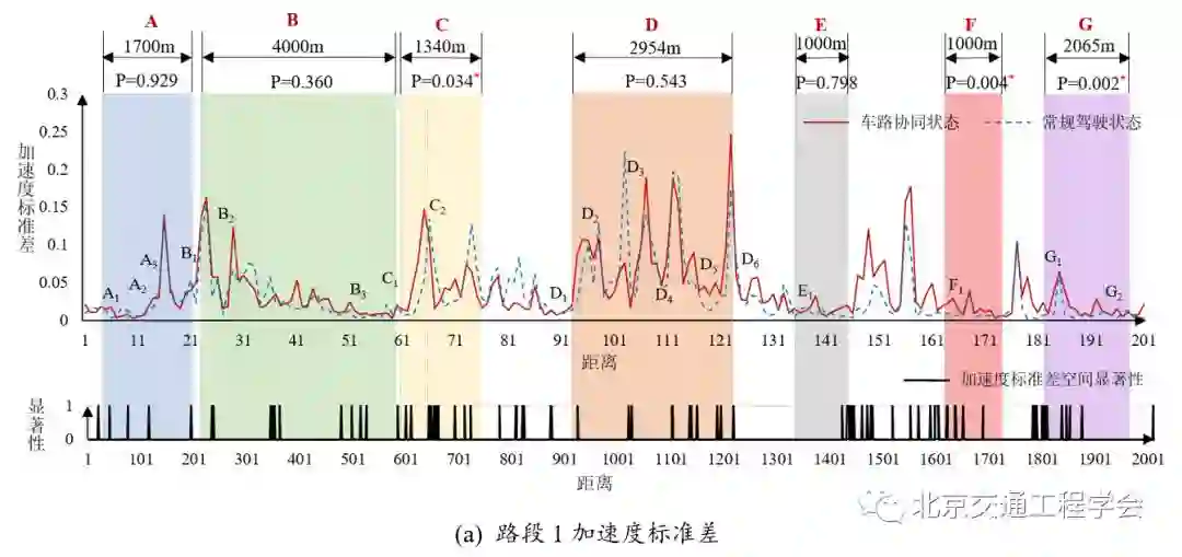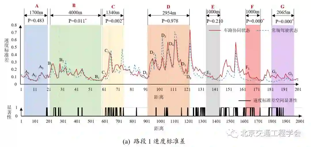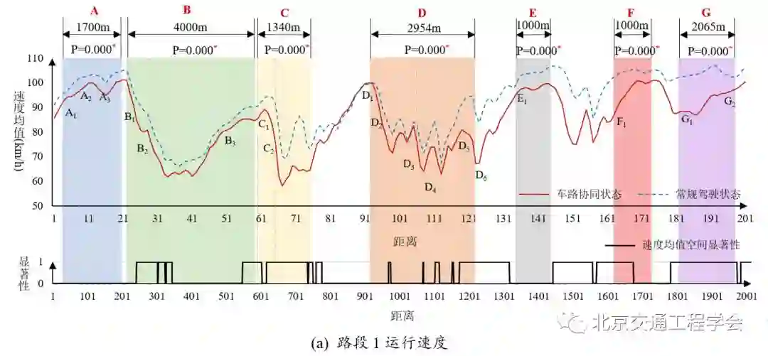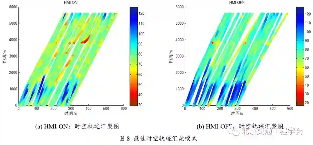 基于被试在驾驶过程中车辆的运动学特征(位置、时间、速度、加速度、横向摆动等)数据,研究特长隧道路段环境下车辆时空运行特性,对比驾驶员在预警系统开启与关闭2种状态下通过特长隧道路段(石峡隧道预警系统)车辆运行状态变化的差异性,并基于试验车辆的纵向时空轨迹汇聚数据,分析预警系统对交通流实际通行效率的影响。将车载系统开启和关闭两种状态下的被试车辆时空轨迹曲线按照最小跟车时距(选取1.5s)的原则进行随机排序(1000次取最优),获得车载设备两种状态下最佳时空轨迹汇聚模式。结果表明,车载系统开启时的时空轨迹汇聚图更加紧密,速度整体比较稳定,有利于交通流整体通行效率的提高。