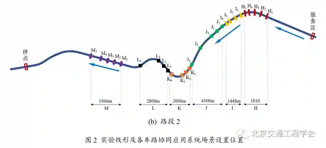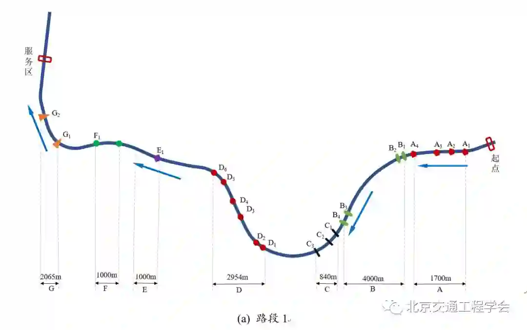 选择兴延高速(总长46km)作为实验场景的设计原型。场景设置为双向四车道,道路横断面为22.4 m (车道宽度= 3.75 m,中位数(绿化带)宽度=2.6 m,肩宽=4.55 m),自由流状态,限速80-120 km/h。为保证数据的有效性,避免被试疲劳驾驶,将路段用服务区分割,两段长度分别为22 km(路段1)和24 km(路段2)。测试平台中各车路协同应用系统设置位置如图2所示。基于该测试平台,设计人机交互系统(HMI),实现了基于驾驶模拟的车路协同应用系统情景再现与人机交互测试,并在高效、安全、生态、舒适及有效性等方面进行了综合评测。