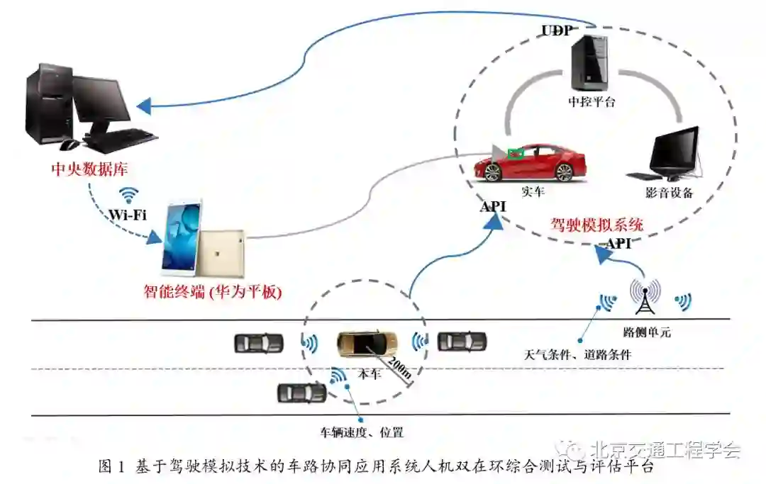 北京工业大学城市交通学院驾驶行为实验室采用驾驶模拟技术搭建了车路协同应用系统人机双在环效能测试平台(图1)。