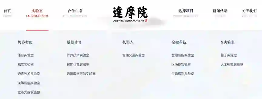 达摩院下设机器智能、数据计算、机器人、金融科技、X实验室几大分支;其中AI力量集中在机器智能实验室。