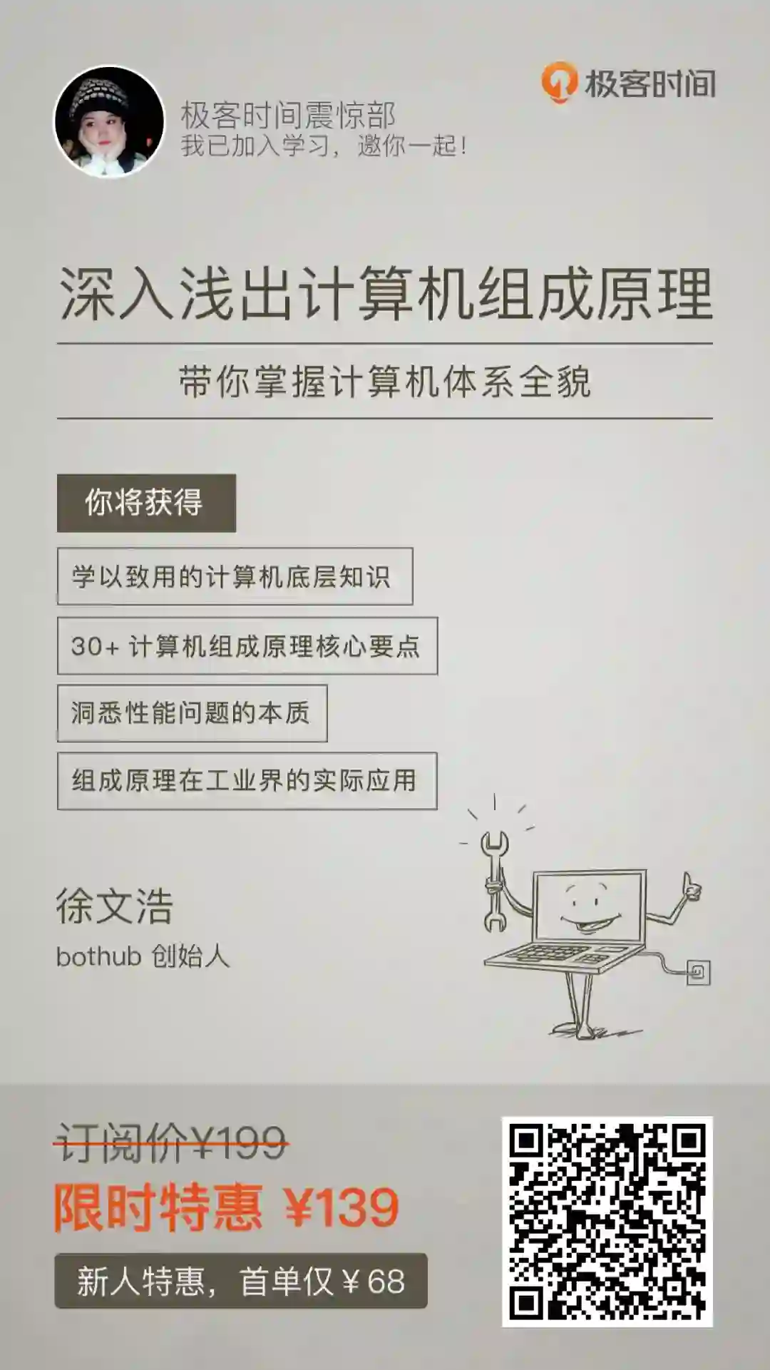 这个专栏原价是 ¥199,老用户现在有个秒杀价,到手 ¥139,新人就更不得了了,只需 ¥68!(极客时间这个新人活动最近才开放的,是真的划算)感兴趣的小伙伴可以先扫码免费试读。