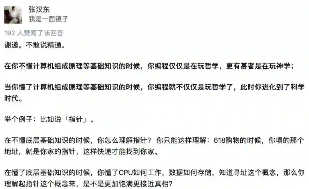 关于组成原理对程序员的作用,我再来引用一下 Rust 大神张汉东在知乎上的回答: