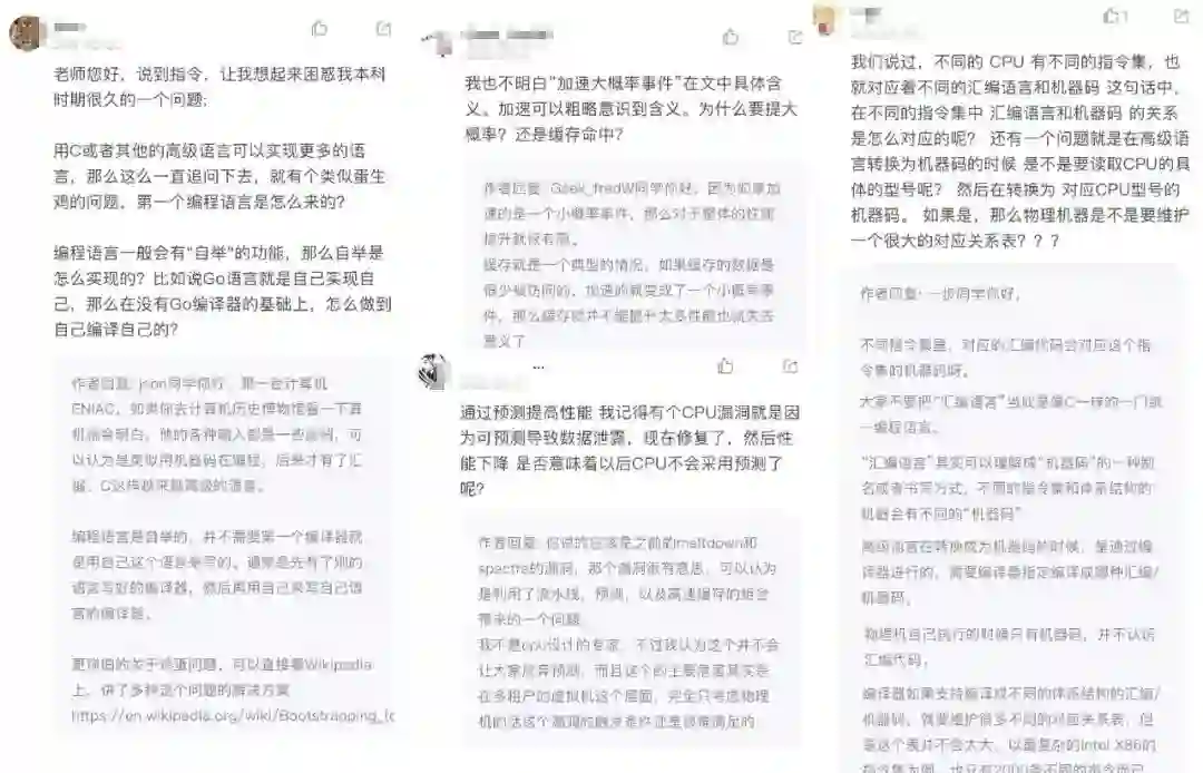 比如,专栏特色之二:每个章节都会留个符合内容的思考题,徐文浩老师经常在评论里解答,这种耐心、负责的分享精神,真的很难得了。