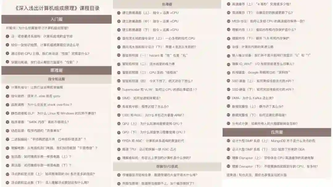 要知道,它可以直接解决你在并发编程、性能优化中经常遇到的一些困惑,比如 CPU Cache 的原理是什么,CPU 和 I/O 之间是如何通信的,虚拟内存是要解决什么问题。可以说,你基本可以掌握计算机的全貌了。