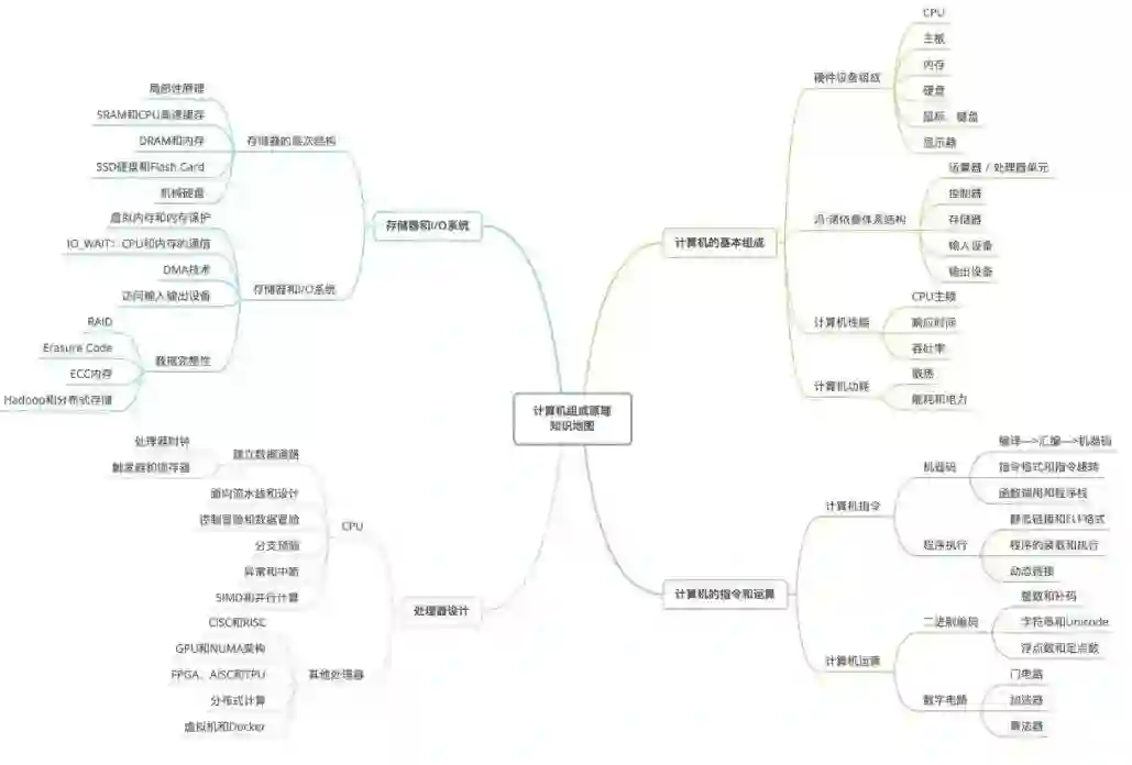这张思维导图,出自徐文浩的专栏《深入浅出计算机组成原理》,这课可以说是我在极客时间学习,收获最大的课之一了,现在已经 6.3W 人学过了。他用工作实际场景 + 软件开发案例,讲了 30+ 组成原理的核心知识,教你真正看懂、学会、记住,从源头理解软、硬件的共同之处,洞悉性能问题的本质。