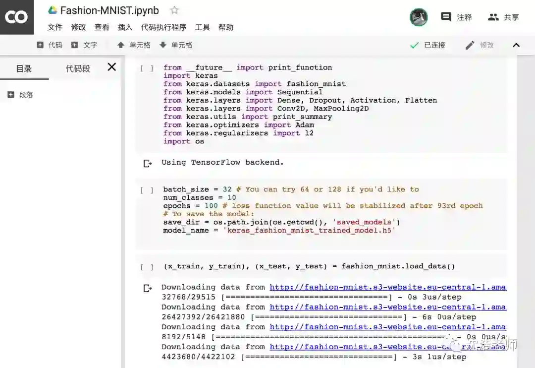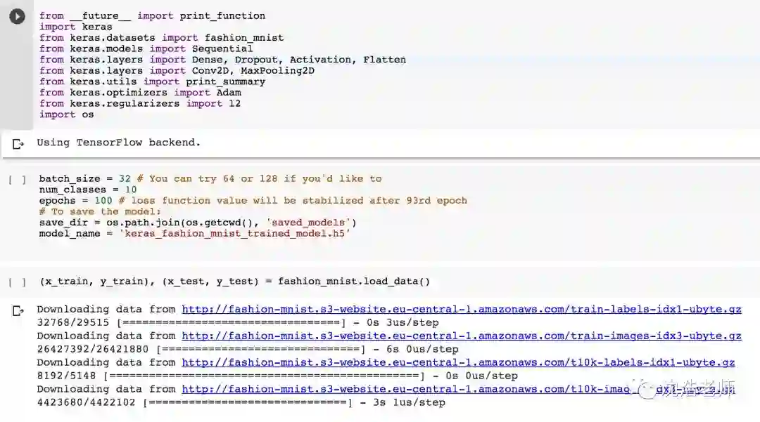 加载各种包,利用Tensorflow backend,下载数据集FASHION-MNIST
