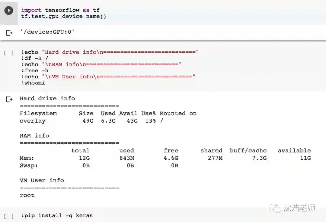 接下来就可以安装深度学习各种框架包了,只要在安装命令行前加上!即可。