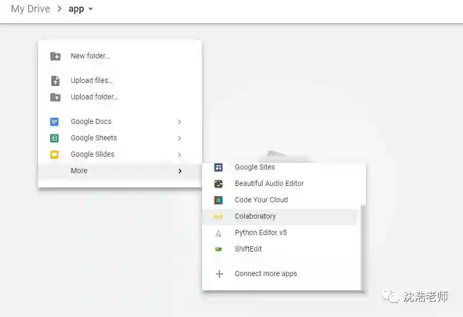 接下来:Create a new notebook via Right click > More > Colaboratory