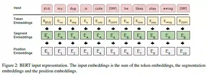 图 2:BERT 的输入表示。输入嵌入是标记嵌入(词嵌入)、句子嵌入和位置嵌入的总和。