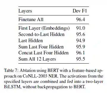 表 7:在 CoNLL-2003 命名实体识别上使用基于特征的方法,并调整 BERT 层数。来自指定层的激活输出被组合起来,并被送到一个两层的 BiLSTM 中,而不需要反向传播到 BERT。
