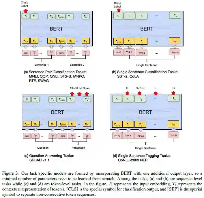 图 3:我们具体于特定任务的模型是通过给 BERT 加一个额外的输出层构成,所以仅需要从头学习最小数量的参数。其中(a)和(b)是序列级任务,(c)和(d)是标记级任务。图中 EE表示嵌入的输入,TiTi 表示第 ii 个标记的上下文表示,[CLS] 是分类输出的特殊符号,[SEP] 是分离非连续标记(分离两个句子)序列的特殊符号。