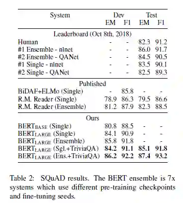 表 2:SQuAD 结果。Ensemble BERT 是使用不同的预训练模型检查点和微调种子的 7x 模型。