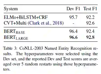 表 3:CoNLL-2003 命名实体识别。模型超参数使用验证集进行选择,报告的验证集和测试分数使用这些超参数进行随机五次以上的实验然后取实验的平均结果。