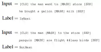 许多重要的下游任务,如问题回答(QA)和自然语言推理(NLI),都是建立在理解两个文本句子之间的关系的基础上的,而这并不是语言建模直接捕捉到的。为了训练一个理解句子关系的模型,我们预训练了一个下一句预测的二元分类任务,这个任务可以从任何单语语料库中简单地归纳出来。具体来说,在为每个训练前的例子选择句子 A 和 B 时,50% 的情况下 B 是真的在 A 后面的下一个句子,50% 的情况下是来自语料库的随机句子。比如说: