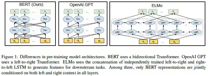 图 1:预训练模型结构的不同。BERT 使用双向 Transformer。OpenAI GPT 使用 从左到右的 Transformer。ELMo 使用独立训练的从左到右和从右到左的 LSTM 的连接来为下游任务生成特征。其中,只有 BERT 表示在所有层中同时受到左右语境的制约。
