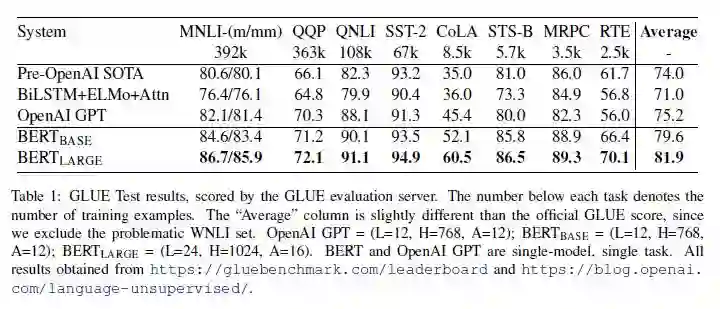 表 1:GLUE 测试结果,由 GLUE 评估服务器评分。每个任务下面的数字表示训练示例的数量。“Average”列与官方 GLUE 评分略有不同,因为我们排除了有问题的 WNLI 数据集。OpenAI GPT = (L=12, H=768, A=12); BERTBASE = (L=12, H=768, A=12); BERTLARGE = (L=24, H=1024, A=16)。BERT 和 OpenAI GPT 都是单模型,单任务。所有结果可以从 https://gluebenchmark.com/leaderboard 和 https://blog.openai.com/language-unsupervised/ 获得。