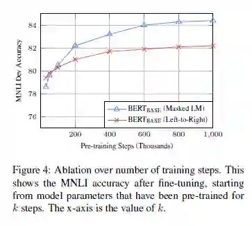 图 4 显示了经过 K 步预训练模型的检查点再模型微调之后在 MNLI 验证集上的准确率。这让我们能够回答下列问题: