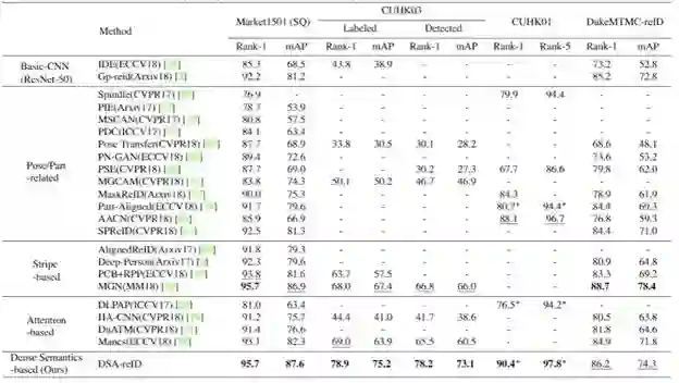 和其它state-of-the-art的方法对比,我们提出的基于密集语义对齐的行人重识别技术在多个benchmark数据集上实现了state-of-the-art性能。在CUHK03数据库上,Rank-1精度实现了10.9%和11.4%的提升。