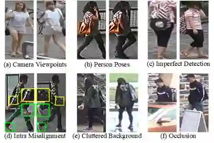 上述的众多实际问题均会导致图像间语义在空间上的不对齐,即对两个要匹配的图片,相同的空间位置对应的内容的语义(Semantics)不同,从而制约了行人重识别技术的鲁棒性和有效性。例如图1(c)中,图像顶部在第一个图片中对应的是肩膀,而第二个图片相应空间位置对应的是头,使得空间上语义不对齐(misalignment)。