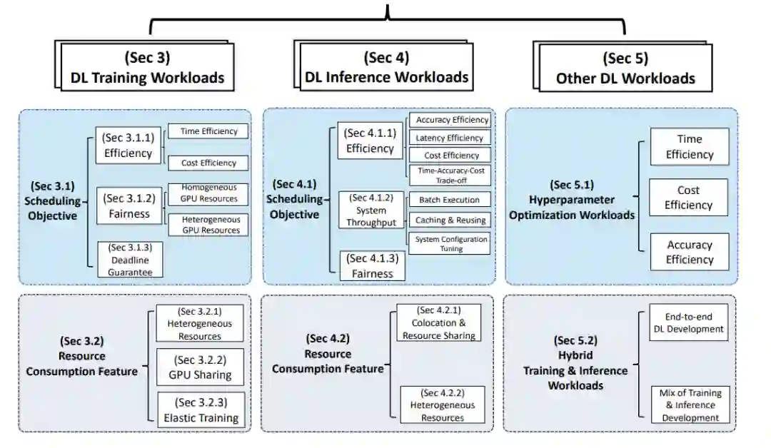 第2节描述了DL工作负载的独特特征以及GPU数据中心调度的挑战。它也说明了这次调研的范围。本次调研的主体部分如图1所示。具体而言,第3节和第4节分别基于调度目标和资源消耗特征对训练和推理工作量进行了详细的分类。第5节讨论了其他工作负载,例如超参数优化、混合训练和推理工作负载。在每一节的末尾也给出了这些研究的启示。第6节总结了这篇调研论文,并确定了调度程序设计的未来方向。
