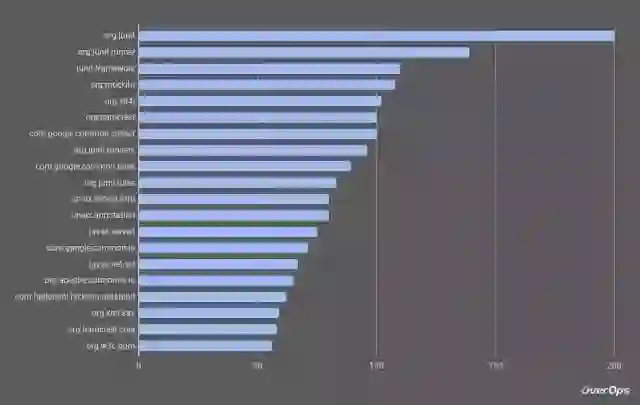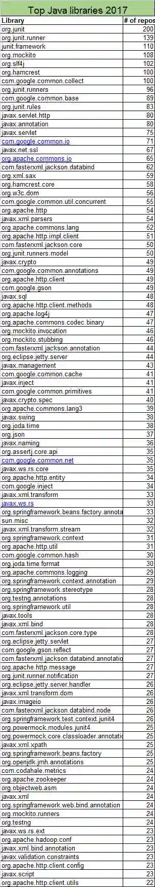 在前 20 个库中,我们可以发现 Google Guava 排名第 7,Guava 框架里面包含很多 JUnit 框架和 javax 库。我们还可以看到,最受欢迎的 JSON 库是 Jackson。