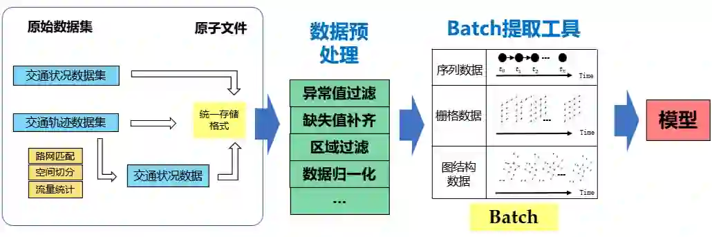 基于原子文件,LibCity 进一步构建了数据预处理和 Batch 提取工具,形成统一的数据处理流程,来将原始数据转换为标准化的模型输入——Batch。