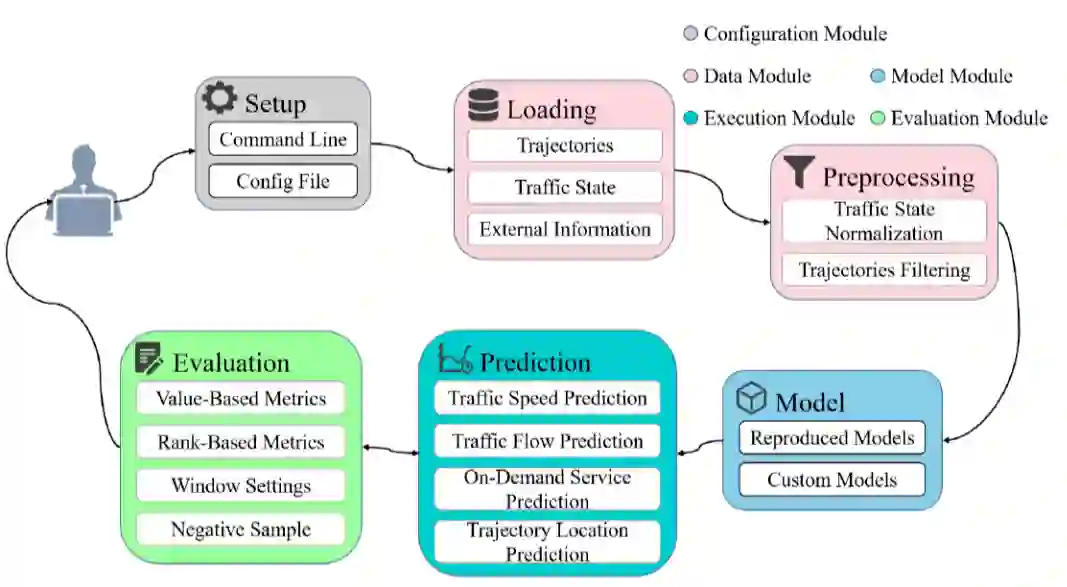 LibCity 将交通预测任务解构为一条模块化的流水线: