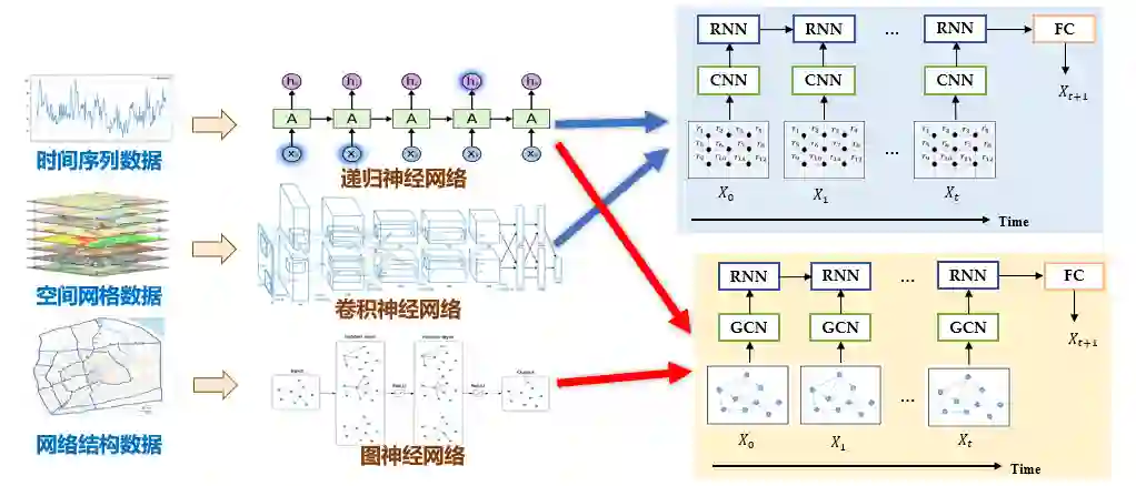 最后,在进行时空融合的时候,一般需要将上述的模型进行结合形成 Hybrid Model,例如 CNN+RNN, GCN+RNN, GCN+CNN 等等。