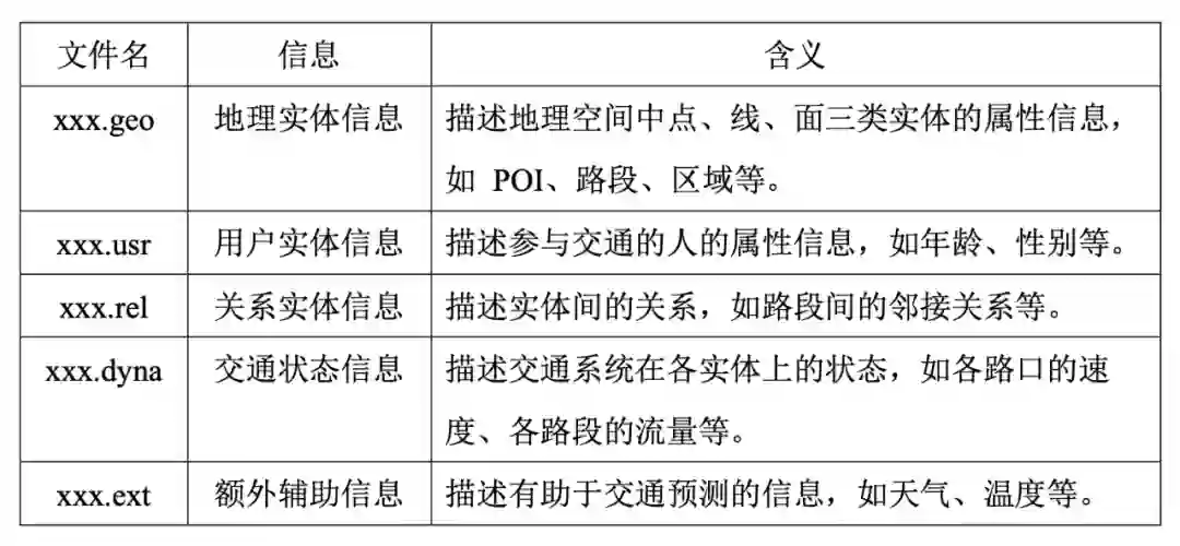 为了统一表示不同种类的交通数据,LibCity 定义了五种原子文件,即交通数据中的五种最小信息单元: