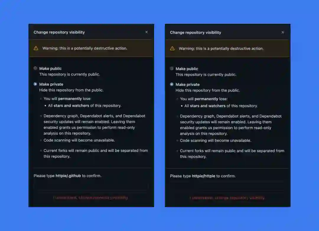 对于这起乌龙事件,Jakub 解释道,他其实知道将代码仓库设置为私有,就会永久删除所有关注者和星级,显然他也无意将 HTTPie 私有化。情况是他在事情发生一周之前创建了一个新的仓库,当他在操作隐藏项目简介时混淆了新的仓库与原来的 HTTPie 项目,从而不小心将 HTTPie 项目私有化,导致项目星星消失。