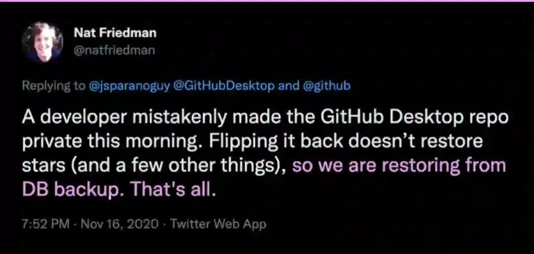 GitHub 官方项目也曾出现过不小心将仓库私有化造成损失的情况。在 2020 年,GitHub Desktop 应用将自己仓库设置为私有,几个小时后项目就恢复正常了。Jakub 团队也向 GitHub 发出了恢复备份的请求。