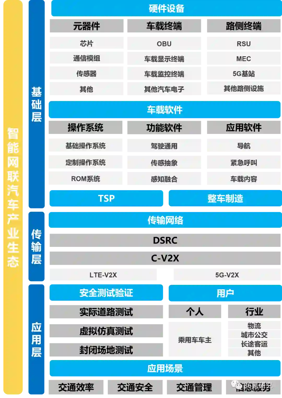 智能网联汽车产业生态可分为基础层、传输层与应用层。