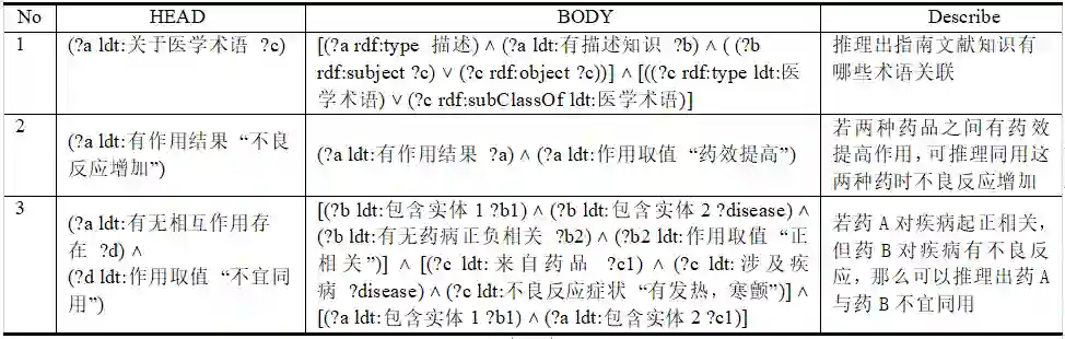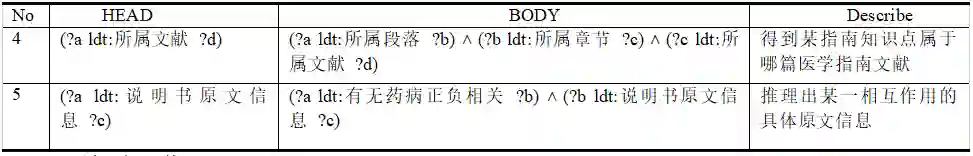 需要指出的是,医学知识的规则和推理远不止下表中所述部分,本文只针对MDO所支持的代表性推理规则进行列举以说明其对于医药文献的词语级细粒度语义知识、结构细粒度知识和可循证知识的表达和推理能力,以上各类规则可在医学专家的辅助下进行扩展。