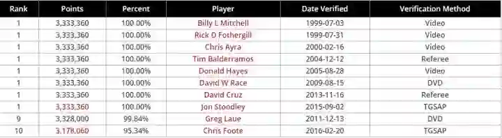 第一个拿下这个分数的,是一位叫做 Billy L Mitchell 的选手,记录创建时间为1999年7月3日。