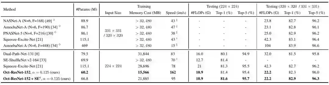 表 7:大型模型的 ImageNet 分类结果。配备有 OctConv 的模型名称显示为黑色粗体,相关研究的性能数据来自相应论文。使用 CuDNN v10.03 在一个英伟达 Titan V100 (32GB) 上以 flop16 评估网络的训练内存开销及速度。采用神经架构搜索的工作标记为 (3)。研究人员将多数例子中的批大小设为 128,但对于大到 GPU 内存无法负荷的网络,他们将批大小减小为 64(带†标记的)或 32(带‡标记的)或 8(带§标记的)。