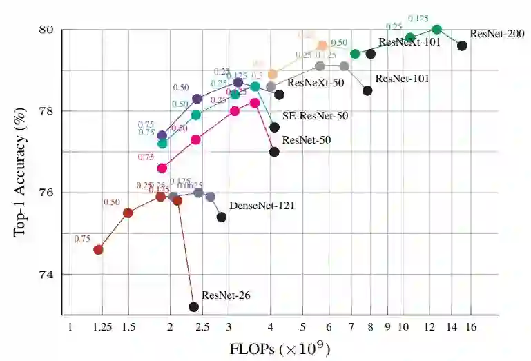 图 4:ImageNet 上的控制变量研究结果。配备 OctConv 的模型较基准模型更有效和更准确。上图每一行的黑色标记●表示没有使用 OctConv 的基准模型。数字表示比例α。横坐标表示计算开销(FLOP),纵坐标表示准确率。