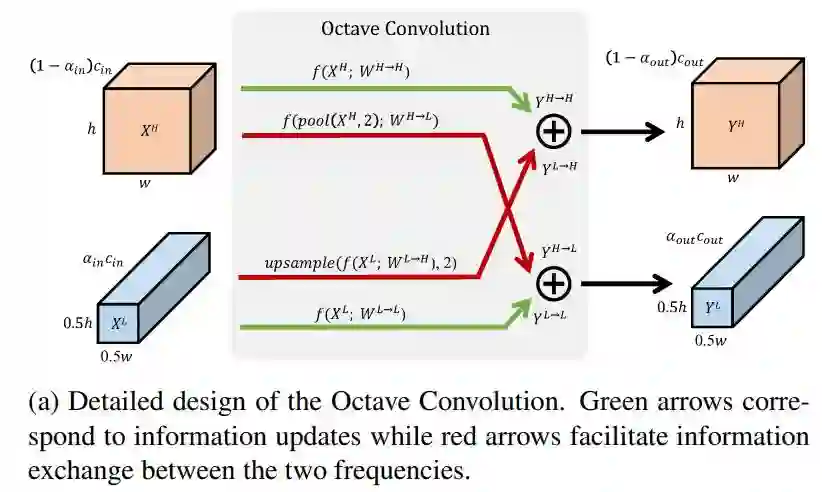 如图 3 所示,本文提出将 特征图分为两组:低频特征(蓝色)和 高频特征(橙红),并将空间上变化较为缓慢的「低频特征图」存储在低分辨率的张量中,共享相邻位置间的特征。而本文所提出的 OctConv 则是一种可以直接作用在该特征表达下的卷积操作。它包含每个频率自身状态的更新(绿色箭头),以及频率间的信息交互(红色箭头)。