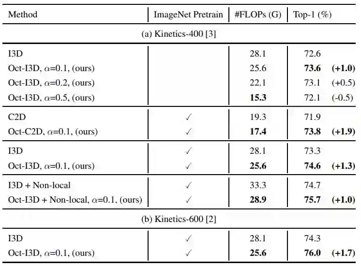 在本节中,研究人员验证了提出的 Octave 卷积对于 2D 和 3D 网络的效能和效率。研究人员首先展示了 ImageNet 上图像分类的控制变量研究,然后将其与当前最优的方法进行了比较。之后,研究人员使用 Kinetics-400 和 Kinetics-600 数据集,展示了提出的 OctConv 也适用于 3D CNN。每一类别 / 块的最佳结果在论文中以粗体字显示。