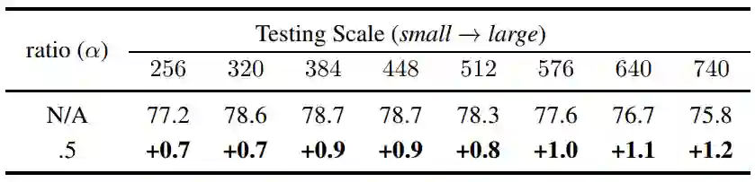 表 4:ImageNet 分类准确度。研究人员通过调整输入图像尺寸,检测网络对不同大小分布的物体的识别率。