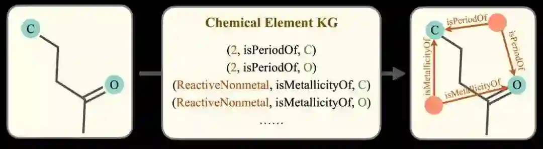 首先,为了建立元素之间的微观联系及各元素的基本领域知识,该研究基于化学元素周期表,构建了化学元素知识图谱 (Chemical Element Knowledge Graph)。如下图所示,化学元素知识图谱描述了元素(图中绿色部分)之间的关系及其基本的化学性质(例如,周期性、金属性,图中红色部分)。