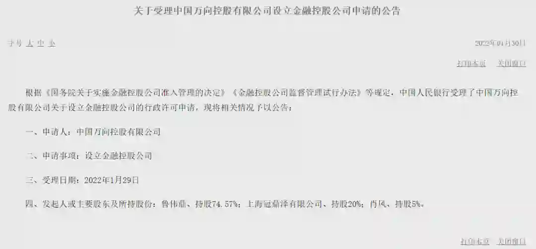 【央行受理首个民营金控牌照申请】1月30日央行官网公告,已受理深圳市招融投资控股有限公司和中国万向控股有限公司设立金融控股公司的申请。其中招融投资控股背后为央企招商局集团,而万向控股实控人为中国知名民营企业家鲁冠球之子鲁伟鼎。(中国基金报)